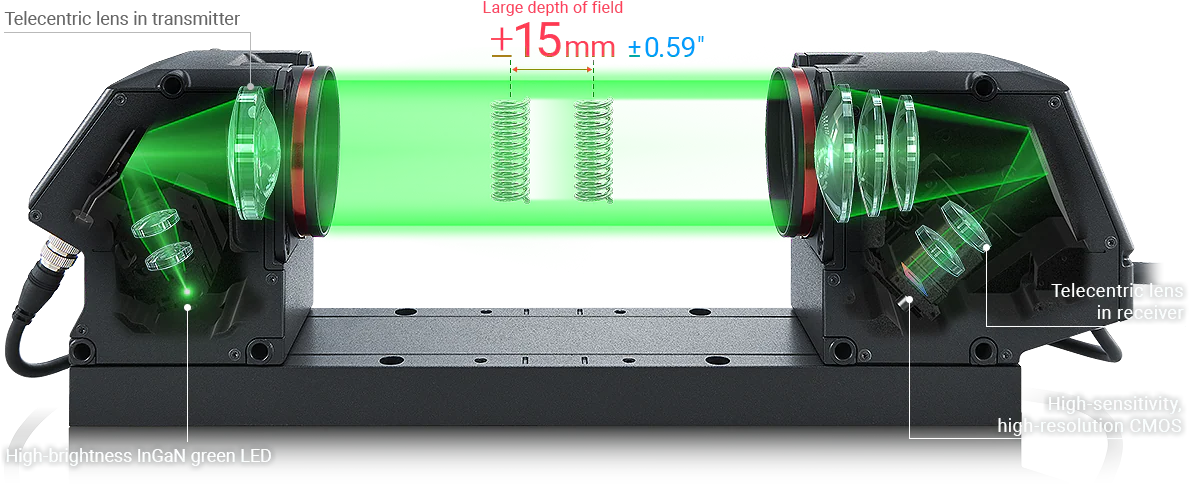 双远心光学系统与远心镜头在发射器和接收器,确保锋利的边缘,而不牺牲精度,即使是对不对准的目标。该技术能够在大景深(+/- 15mm)下进行稳定测量,为在线测量提供了一个可靠的解决方案。