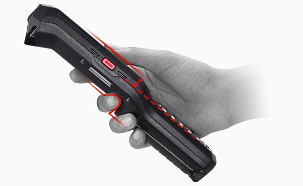 该设备包括一个手指休息钩的背面,以提高处理和稳定性。此外,LCD面板从握把略微提高,以允许稳定的单手操作硬键和触摸屏。