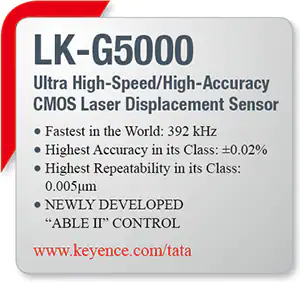 Tata Steel Rail France takes great care in inspecting the straightness of the ends of its rails so that its customers receive the straightest possible rails. As a result, it has recently retrofitted its end straightness inspection systems with KEYENCE’s latest generation of CCD laser displacement sensors, the LK-G3000. During rail inspection, a carriage moves along the end of a rail at a rate of 3 meters per second and over a distance of 3.2 m. The carriage is equipped with two LK-G displacement sensors that profiles the rails surface at a rate of 10,000 samples per second. If the rail is not straight, it is transferred to a press to be straightened to the desired tolerance. Measurements are extremely fast and the accuracy achieved is in the order of a few hundredths of a millimeter.