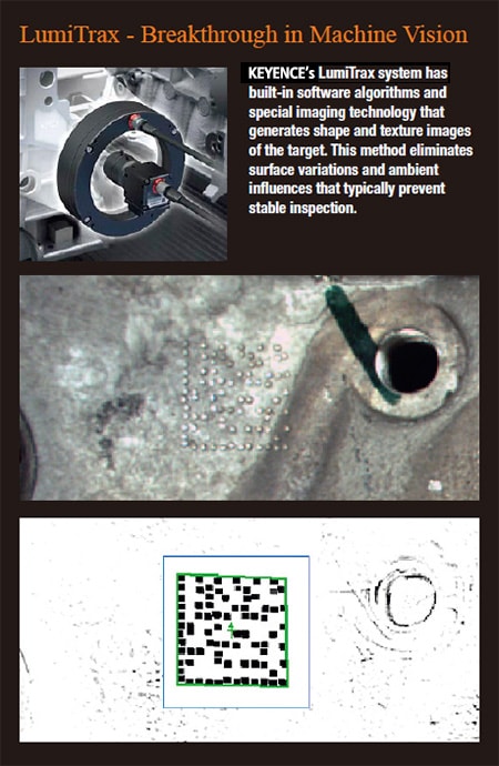 当时,KEYENCE公司最近推出了LumiTrax™技术,该技术结合了超高速CMOS传感器、局部照明LED照明和先进的检测算法,提供了一个成像解决方案,可以轻松地检测特征、形状和文本,即使是最具挑战性的零件表面。传统的成像系统可能会受到环境照明和工件方向变化的不利影响,与之不同的是,LumiTrax™使用高强度、多向光源捕捉多达16张独立的彩色或单色图像,然后分析每个像素点的相对亮度水平,从背景表面图案中分离出不规则点。其结果是一个系统能够快速且反复地“看到”在大多数情况下不可能检测到的对象。