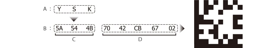 将“YSK”转换为DataMatrix代码:YSK编码和纠错码计算如下,并排列成正方形。