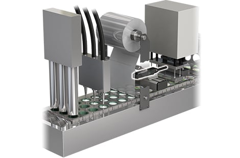 CIJS打印用作密封杯子的胶片上的胶片上的日期代码。虽然杯子在行中移动,但填充内容物,然后印刷的盖膜在杯子上被热密封。打印头可以安装到横穿臂以有效地移动和打印日期代码。