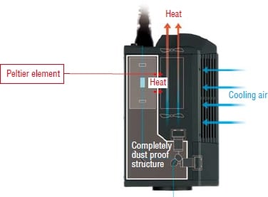 一种使用珀尔蒂埃元件将热量从激光振荡器上传导出去并冷却的系统。使用空气,不需要冷却水。 |