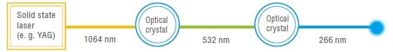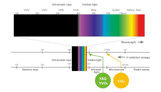 | 第三次谐波产生(THG) | 激光基波频率的三倍或基波波长的1/3。对于YAG激光器,1064 nm的1/3表示波长为355 nm (UV激光器)。 |