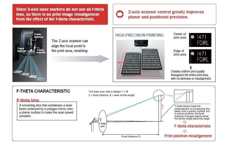 传统激光器使用f- θ透镜将其焦点对准打印区域的边缘。3轴激光打标机使用z轴控制来对齐打印区域的所有焦点,大大提高了曲面和平面上的精度。