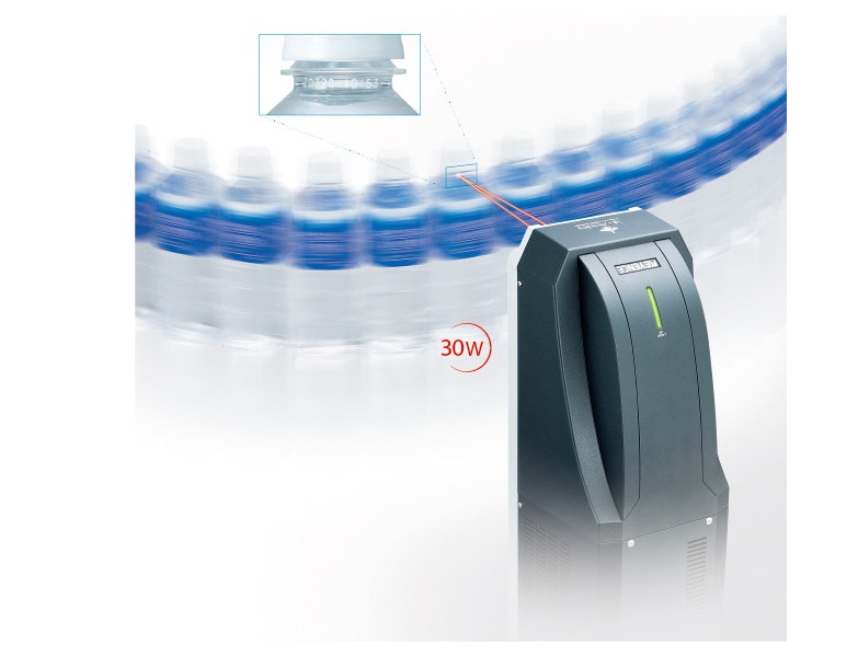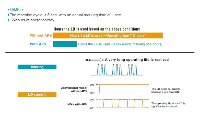KEYENCE激光笔在打标时只使用激光二极管(LD)。这是可能的,因为自动节电(APS)功能,自动降低电流提供给LD光源时,激光不打标。由于只有电流被降低,LD的电源不被关闭,系统可以在瞬间返回到全标记容量。