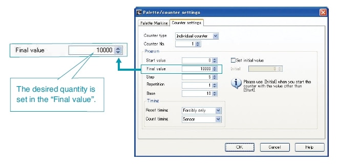 使用软件中的计数器设置和激光终端块上的计数器输出。在设置中,将需要标记的产品数量设置为“最终值”,当达欧宝官网开户到最终值时,监控计数器输出信号。输出可用于停止生产、报警等。