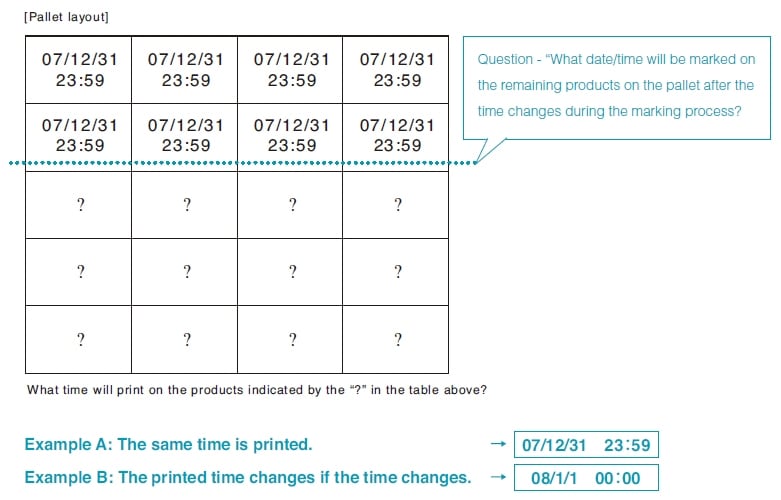 标记生成器提供了对标记计时的控制。当设置为“By Trigger”时,第一个产品的打印计时适用于栈板上所有剩余的产品(见示例A)。当设置为“Each Marking”时,每次激光标记一个部件时,获取并使用该时间(见示例B)。欧宝官网开户