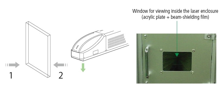 The purpose of the film is to prevent laser emissions from escaping the protective cover. Adhering the film to side 2 (the inner surface) is recommended whenever possible, because placing it on side 1 (the outer surface) may cause laser emissions to scatter as they enter the acrylic plate.