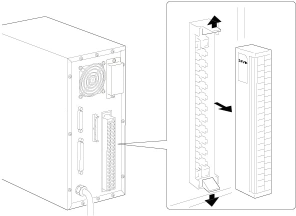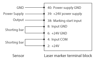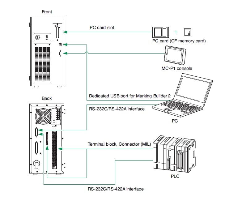 Yes, the rear panel of the controller is equipped with a terminal block and an MIL connector which allows users to wire a sensor, a PLC, or a control device to the laser marker. By registering the marking settings beforehand, the user can switch the marking type with the I/O terminals. A wide range of control is possible with just the I/O terminals. The terminal block can be detached by releasing the locks at the upper and lower ends.