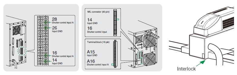 KEYENCE's shutter control inputs prevent laser radiation from being emitted. The laser is disabled when the connector pins are released. Shutter control inputs are controlled by two circuits: terminal A and terminal B. If either one is released, the shutter closes and laser scanning stops. If both ends short, the shutter opens and the sensor switches to standby mode.