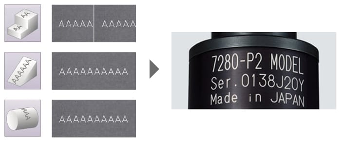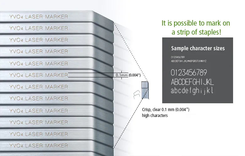 最小和最大字符大小完全取决于激光标记的模型和类型。KEYENCE激光标记可以创建大小从0.1毫米(0.004”)到300毫米(11.81”)的清晰字符。