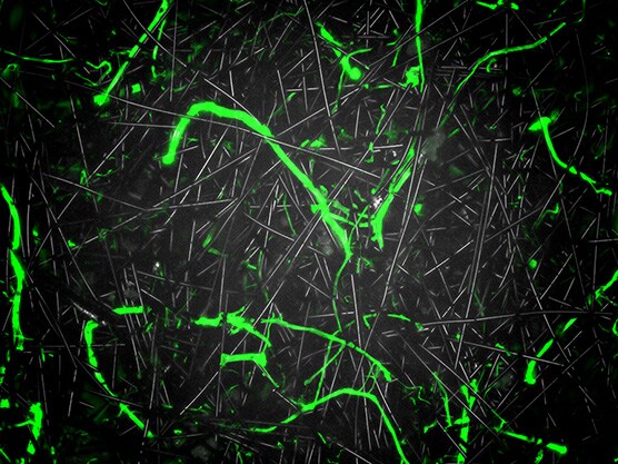为了保持骨料状态,需要均匀地施加粘合剂并完全以缠结方式分散。然而,因为纤维材料和粘合剂通常是白色或透明的,所以难以用光学显微镜可视化其施用条件。