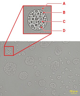 为了研究乳化和分散的稳定性,获得稳定的生产条件或准确地确定各种处理时的状态,必须使用显微镜直接观察乳状液的状态。对结构的精确成像需要高分辨率,特别是含有微小液滴(内部水相)的双乳状液,由于分辨率的限制,无法用标准光学显微镜观察到。由于需要真空,由水和油相组成的双乳状液也很难用扫描电子显微镜(SEM)观察。