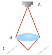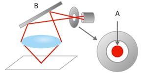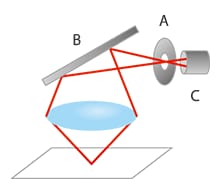 Confocal microscopes transmit light via the objective lens onto the target. The light is focused, via an objective lens, in the focal point of the desired measurement area of the target.