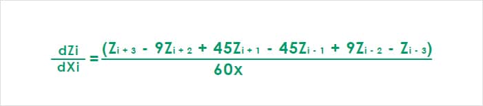 局部倾斜是指Z(x)的衍生物。衍生物通常使用下面所示的七点公式(因为任一端的前三个点缺少足够的数据,使用三分或五点公式)。