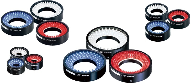 The CA-DR Series includes flat, horizontally arranged LEDs, which help provide uniform intensity across a target. Ring lights are available in six sizes and three colors, with optional diffusion and polarizing plates, making it well suited to a wide variety of basic application and camera needs.