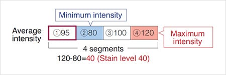 - It determines the difference between maximum and minimum intensities of 4 segments, including a standard segment (① 95 in the figure below). The difference is considered the stain level of a standard segment.