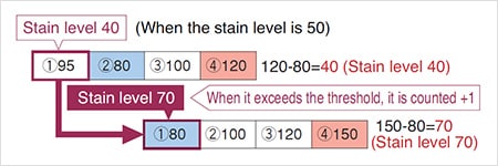 - 当污渍水平超过当前阈值时,标准段计为染色。预设阈值超过测量区域的次数称为“污渍区域”。该过程重复以在测量区域内不断地移位标准段。