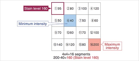 It is possible to detect smaller and more subtle intensity changes (stains) by comparing 16 segments in total, not just 4 segments in the X direction.