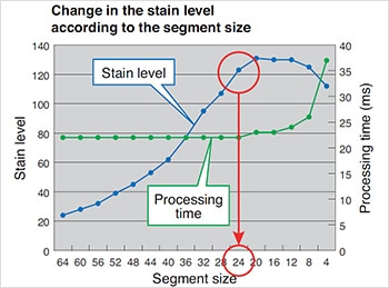 The graph on the right shows changes in the stain level and processing time according to the segment size (with KEYENCE’s CV-X Series).