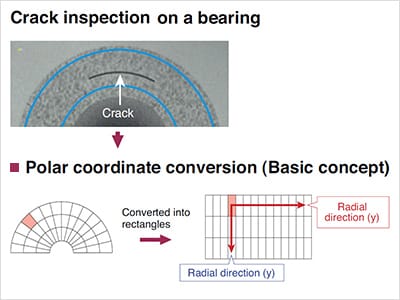 当CV-X系列正在搜索圆形区域时,该程序正在执行极性坐标转换。为了检测污渍,它将圆形窗口(检查段)转换成矩形并比较圆形和径向方向上的区段强度。