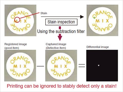 In pre-processing, a proper image is registered and then compared with the current image with the subtraction filter. Then, the average intensity of the filtered image is compared in 256 levels. This enables stain inspection of workpieces with complicated printing.