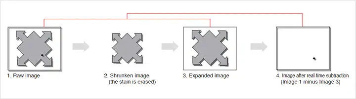 The real-time subtraction filter extracts only small defects by differentiating the original image from an image using the Expansion and Shrink filters. With this filter, you neither have to specify the inspection area nor adjust for the displacement of the target (good for complicated shapes). You can inspect targets with complicated shapes by adding one simple setting adjustment.