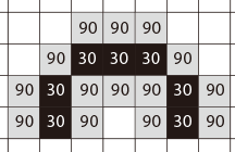 眼睛的值为30,几乎是黑色的,周围区域的值为90,比30亮。