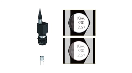 Inspect the strength of the marking on the top surface of electrolytic capacitors. Although conventional machine vision could recognize marked characters, they could not differentiate subtle differences such as strength or fading.