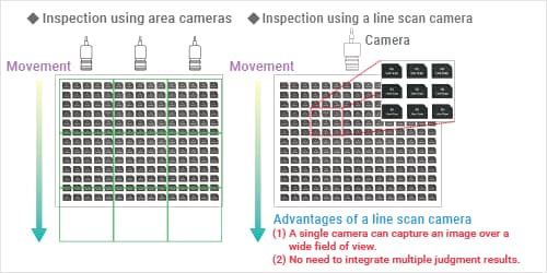 线扫描相机允许在相同的照明条件下检查大面积。这大大提高了易受光照不均匀影响的液晶面板外观检测的稳定性。在传统系统中,用线扫描相机代替区域相机需要检查与现有仪器的兼容性,更改设置和编程。对于XG-X/CV-X系列,线扫描相机可以像区域相机一样使用。由于也可以混合使用区域相机和线扫描相机,系统可以灵活适应未来规格的变化。