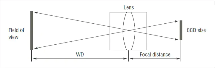 镜头规格之一是焦距。工厂自动化中使用的典型镜头尺寸包括8毫米0.31“,16毫米0.63”,25 mm 0.98“和50 mm 1.97”。您可以计算工作距离(WD),这是摄像机焦点的点,从视场(FOV)和目标捕获目标所需的焦距。