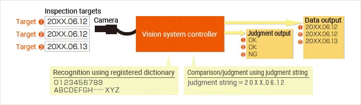 Although the purposes are different, the basic operation of character inspection is to extract characters one by one from a captured image, compare them with characters in the registered dictionary, and identify characters.