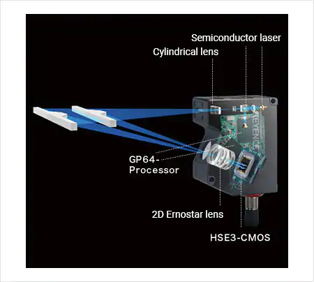 XR系列使用模式投影方法。它以高速从左右投射条纹图案,并利用超高速CMOS和特殊处理器分析反射光,生成3D图像。从两个方向投射模式来合成轮廓信息,可以在没有盲点的情况下捕获图像。XR系列还可以作为区域相机捕捉2D(黑白阴影)图像。同时进行2D和3D检测的能力是另一个优势。