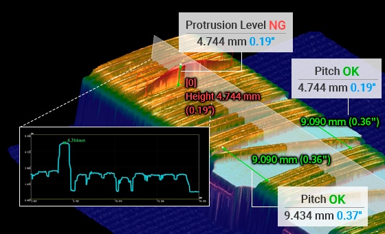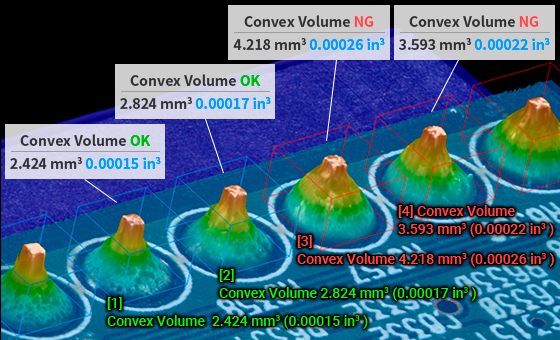 使用实际尺寸来测量体积、横截面积、最大高度等特征,允许检查焊点不规则性、冷焊点、桥、峰等异常。